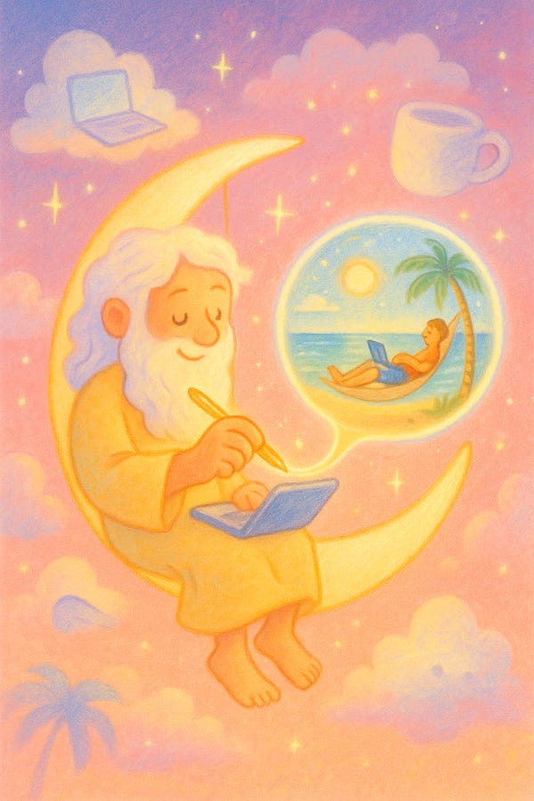 It showed a writer lounging in a hammock, laptop perched on knees, a turquoise ocean in the background. The Barefoot Writer from AWAI.